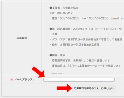 このページの下部にある「応募規約」をご確認の上、受信確認ができるメールアドレスをご入力いただき、「お申込み」ボタンをクリックして下さい