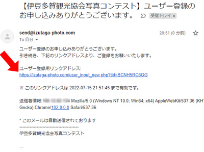 ご入力いただいたメールアドレス宛に【多賀観光協会(熱海市)写真コンテスト】というタイトルの入ったメールが届きます。このメール内のリンクをクリックしてください。