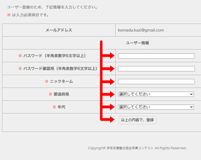 ステップ2でリンクをクリックしますと、ユーザー登録フォームが表示されます。「パスワード」、「ニックネーム」、お住まいの「都道府県」、応募者の「年代」をご入力いただき、「以上の内容で登録」をクリックしてください。登録完了画面にマイページへのリンクが表示されますので、こちらをクリックして写真投稿ページへ移動してください。