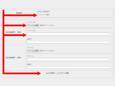 「ファイルを選択」ボタンをクリックし、タイトルを入力してからページ下部の「以下の内容で、コンテストに投稿」をクリックして下さい。